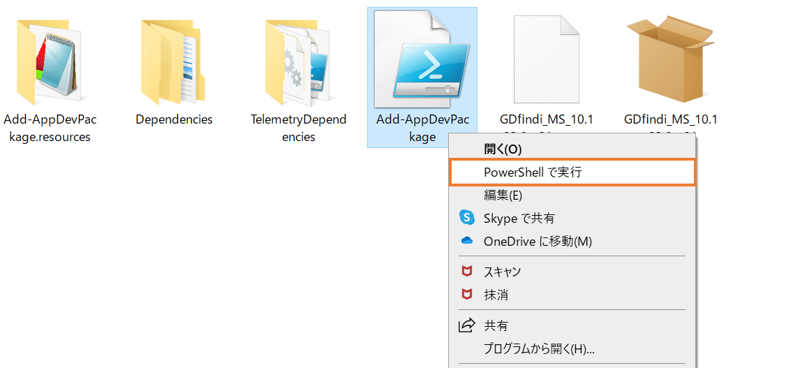 3. 解凍したフォルダに含まれるファイル「Add-AppDevPackage.ps1」を右クリックして「PowerShellで実行」を選択します。