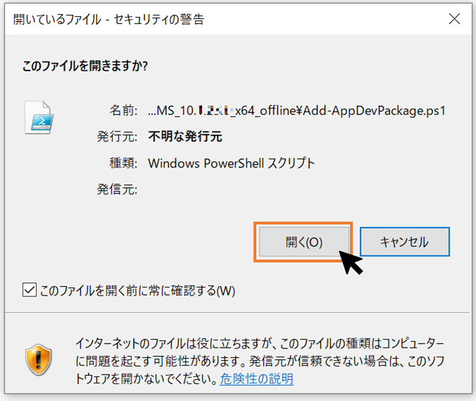 ※以下のようなセキュリティの警告が表示されましたら、「開く」をクリックしてください。