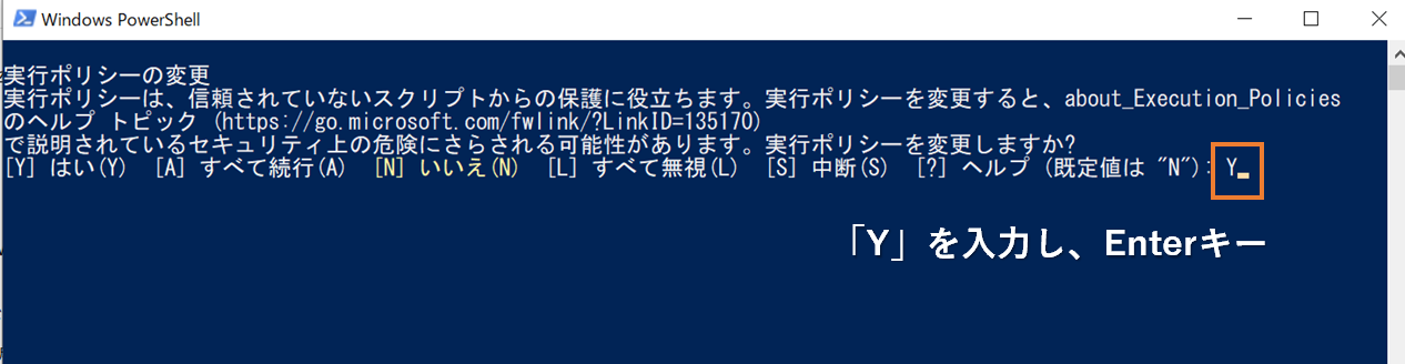 4.「実行ポリシーを変更しますか?」というメッセージが表示されたら、「Y」を入力して、Enterキーを押します。