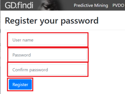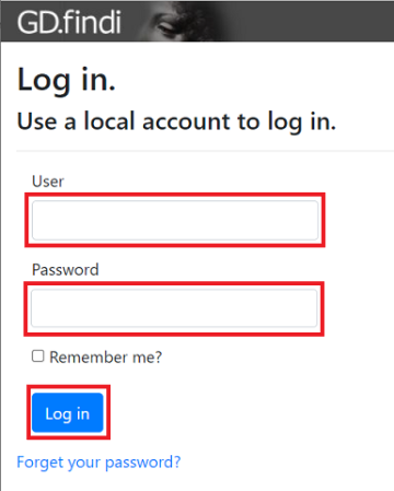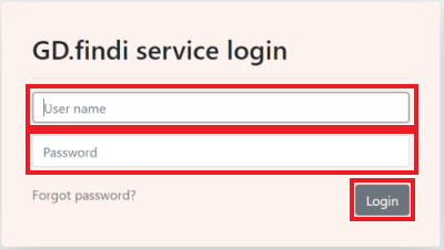 GD.findiのユーザ名とパスワードを入力し、「Log in」ボタンをクリックします。
