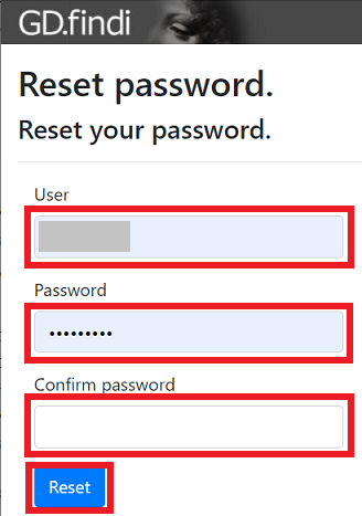 「Password」と「Confirm Password」に新しいパスワードを入力し、「Reset」ボタンをクリックします。